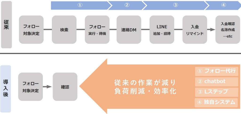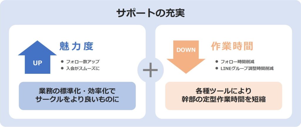 Linklop では学生の限られた時間を有効に使ってほしいと考えています。しかし、サークルの運営業務は多くの労力と時間を要します。そこで、Linklop ではサークル運用を効率化するために独自のツールを開発し、新歓業務やSNS運用などのお手伝いをしています。