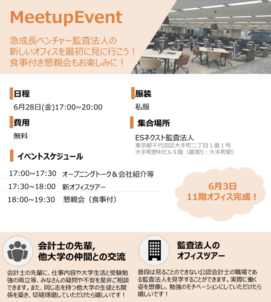 この機会に実際のオフィスを見学し、経験豊かな会計士や他大学の会計士受験生たちと交流しましょう!