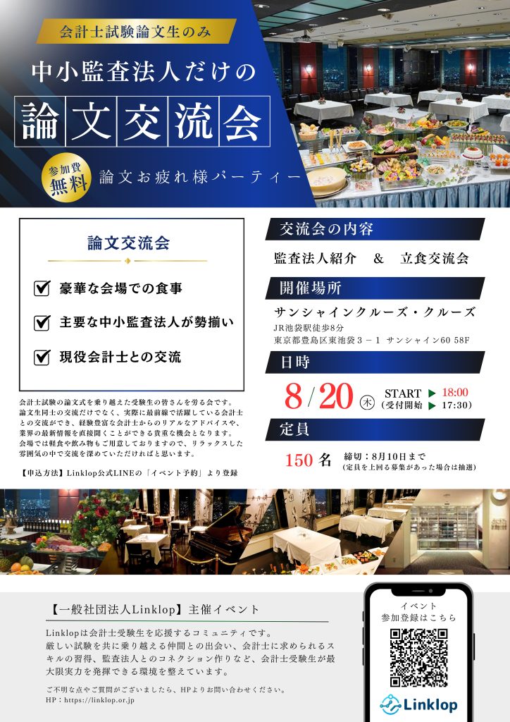 試験の疲れを癒しつつ、Big4以外の監査法人に触れる貴重な機会となります。Linklop運営イチオシの企画ですので、後悔させません!是非ご参加ください。